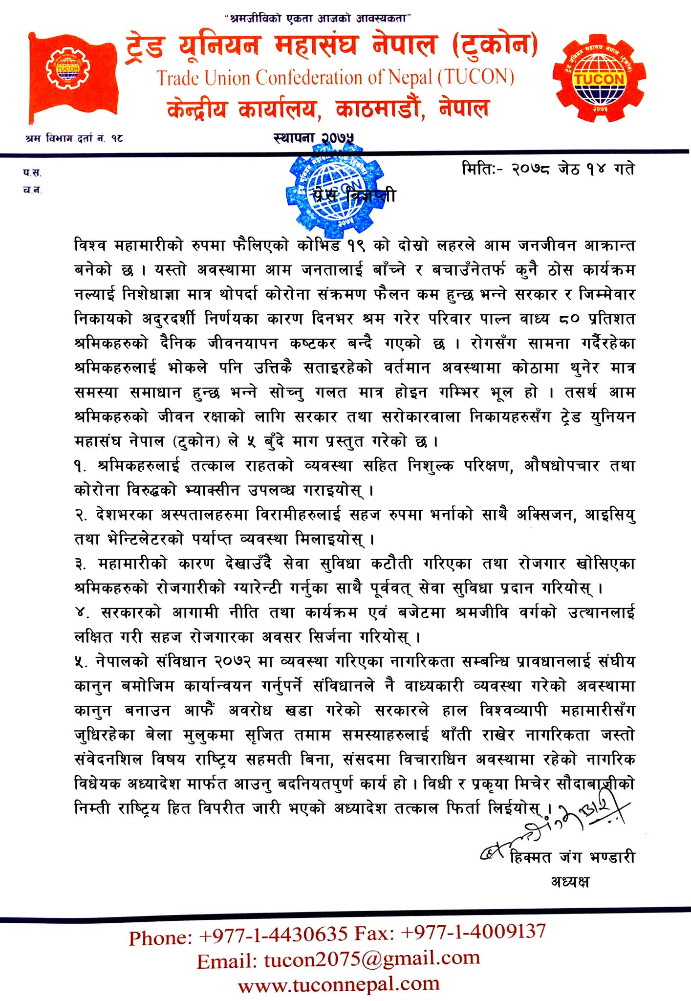टुकोनद्वारा आज प्रकाशित विज्ञप्तीमा भनिएको छ– ‘विश्व महामारीको रुपमा फैलिएको कोभिड १९ को दोस्रो लहरले आम जनजीवन आक्रान्त बनेको छ । यस्तो अवस्थामा आम जनतालाई बाँच्ने र बचाउँनेतर्फ कुनै ठोस कार्यक्रम नल्याई निशेधाज्ञा मात्र थोपर्दा कोरोना संक्रमण फैलन कम हुन्छ भन्ने सरकार र जिम्मेवार निकायको अदुरदर्शी निर्णयका कारण दिनभर श्रम गरेर परिवार पाल्न वाध्य ८० प्रतिशत श्रमिकहरुको दैनिक जीवनयापन कष्टकर बन्दै गएको छ । रोगसँग सामना गर्दैरहेका श्रमिकहरुलाई भोकले पनि उत्तिकै सताइरहेको वर्तमान अवस्थामा कोठामा थुनेर मात्र समस्या समाधान हुन्छ भन्ने सोच्नु गलत मात्र होइन गम्भिर भूल हो । तसर्थ आम श्रमिकहरुको जीवन रक्षाको लागि सरकार तथा सरोकारवाला निकायहरुसँग ट्रेड युनियन महासंघ नेपाल (टुकोन) ले ५ बुँदे माग प्रस्तुत गरेको छ ।